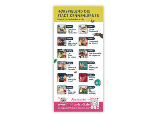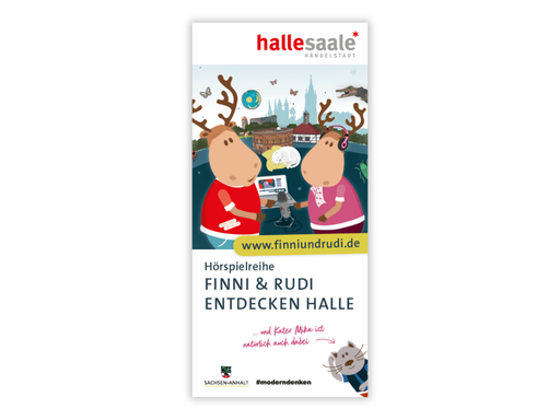 Vollständige Details anzeigenFlyer Hörspielreihe "Finni & Rudi entdecken Halle"