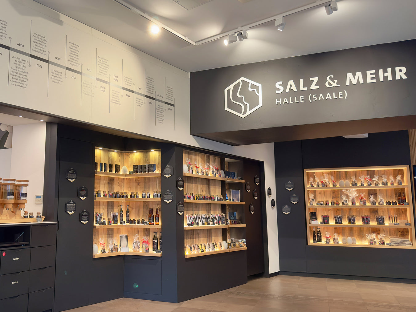 Neben feinen Salzspezialitäten in verschiedenen Sorten und Größen, deren Namen an die hallesche Salzgeschichte anknüpfen, gibt es im Sortiment von SALZ & MEHR zudem stilvolle Küchenhelfer, regionale Manufakturprodukte bis hin zu glitzerndem Schmuck aus Salzkristallen. Besuchen Sie auch gerne vor Ort unsere Salzmischstation und kreieren Sie Ihre ganz persönlichen Salzkompositionen – abgestimmt auf Ihren Geschmack und Ihre Lieblingsgerichte.